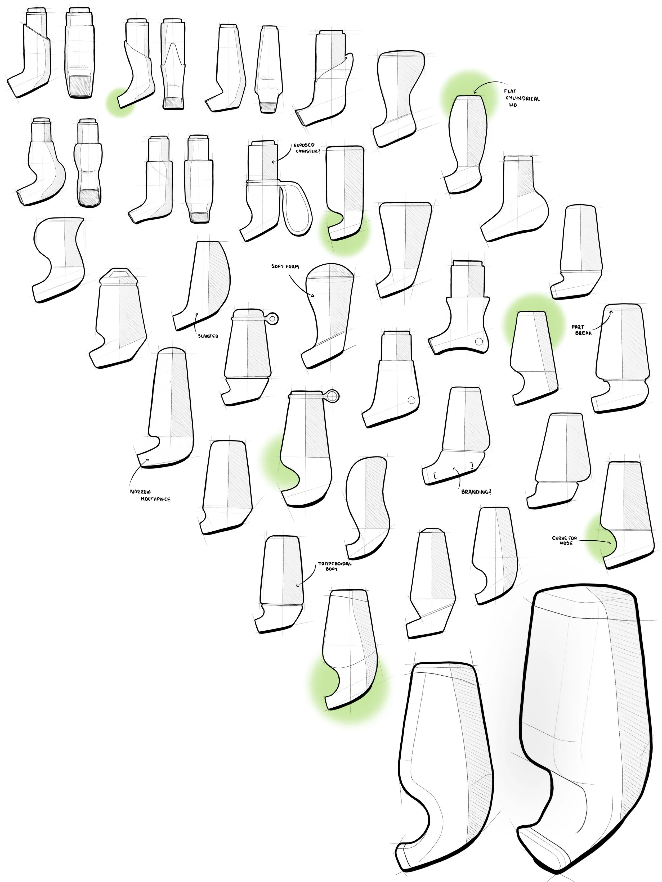 By following the product design’s creative strategy, to promote correct usage, the form of the inhaler should reflect that of a narrow and slanted mouthpiece so it prompts the user to tilt their chin back.