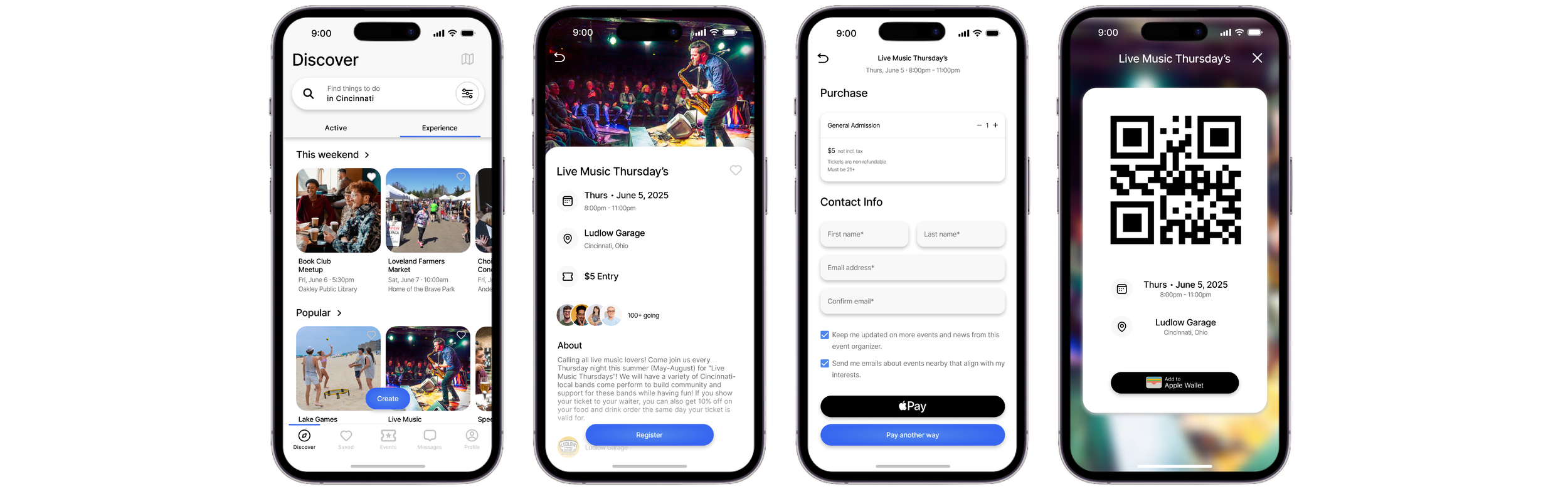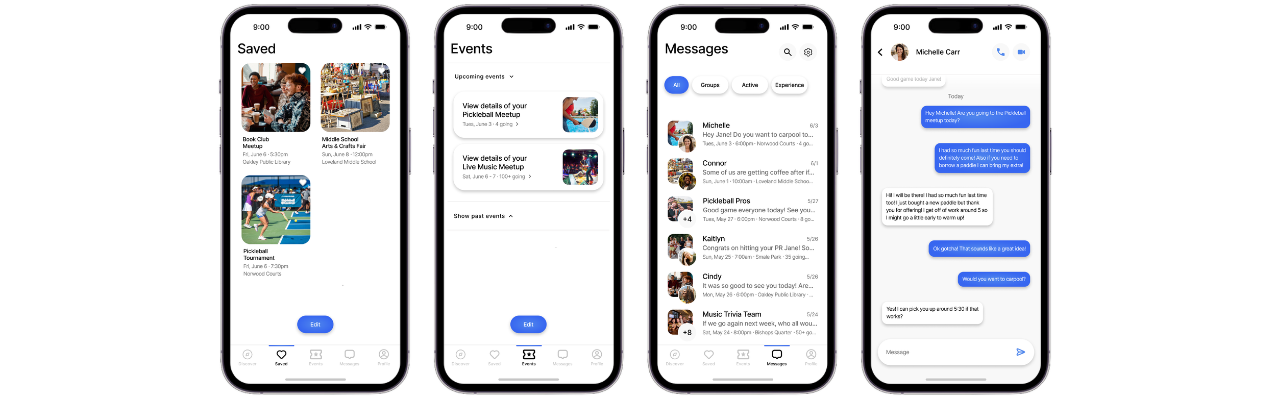 Additional pages to highlight saved, upcoming, and past events, as well as messaging other event attendees.